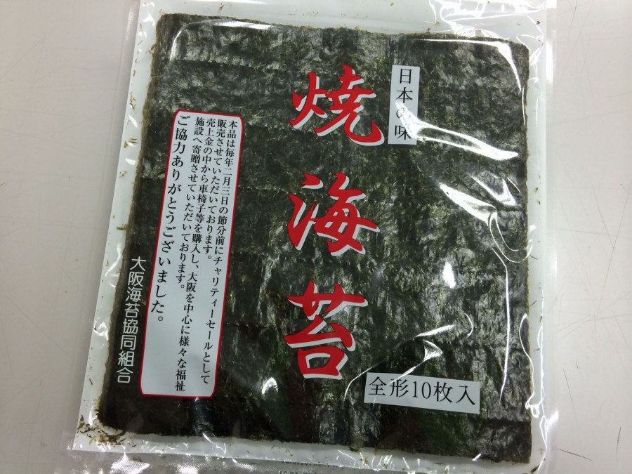 大阪天満宮のお膝元、かつて天満青物市場としてにぎわった大川沿いの菅原町は、もともと乾物問屋街。海苔や昆布、かんぴょうやごまをなどを扱う商店が今も残っています。当日は海苔のチャリティーセールも行われ、行列が続きました。売上金は、大阪社会福祉協議会を通じて、車いすの購入などの福祉事業に寄付されます。