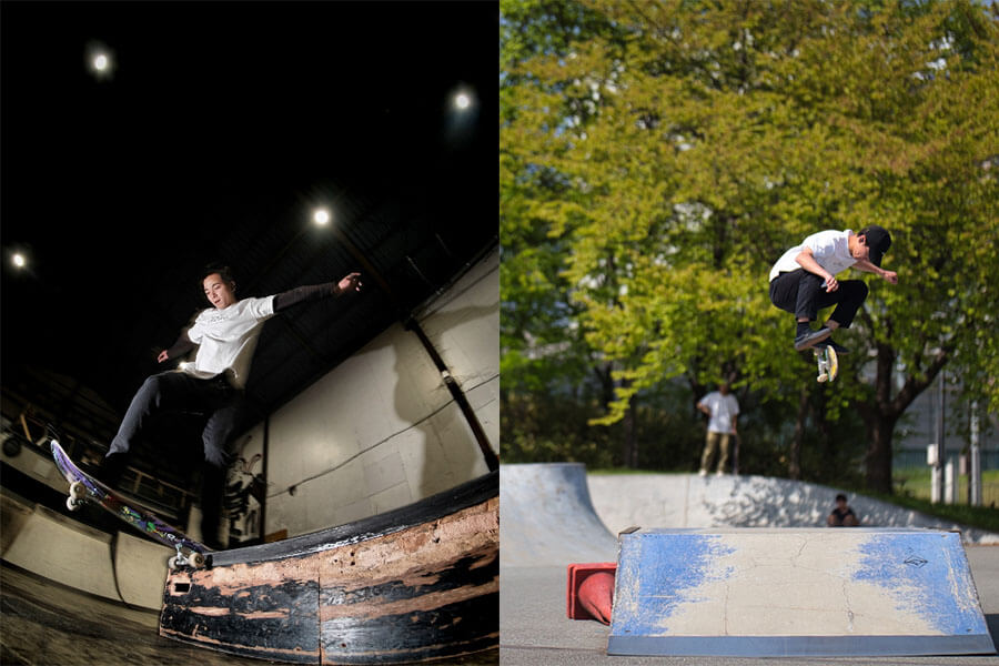 豪快なアクションを決めるBMX(左)とさまざまな技を披露するスケートボード