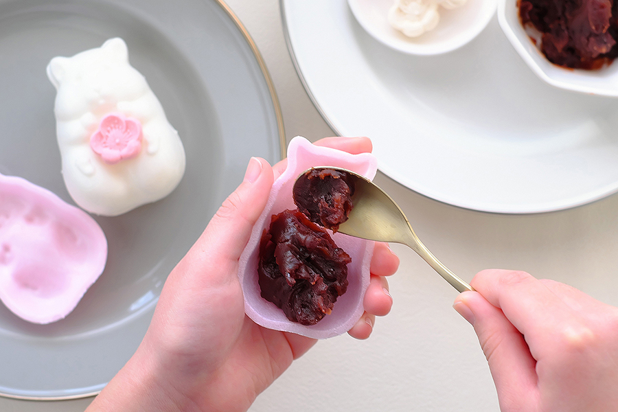 パリッと香ばしいモナカの皮に甘すぎない粒餡を自分で詰めるスタイルで、紅白バージョンでは皮がピンクと白色に変更。ハムスターのおなか部分に付属の梅型らくがんを置くと、まるでハムスターが梅を抱きかかえているようなキュートでおめでたい姿に変身する。