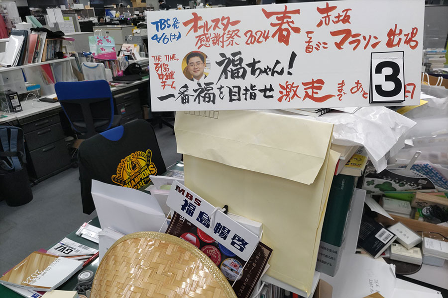 MBS社内では、福島アナのデスク回りに「福ちゃん! 一番福を目指せ、激走まであと○日」とカウントダウン板が設置され、列島中継チームの応援うちわも作成されるなど、アナウンサー室は熱い空気が漂っているという。