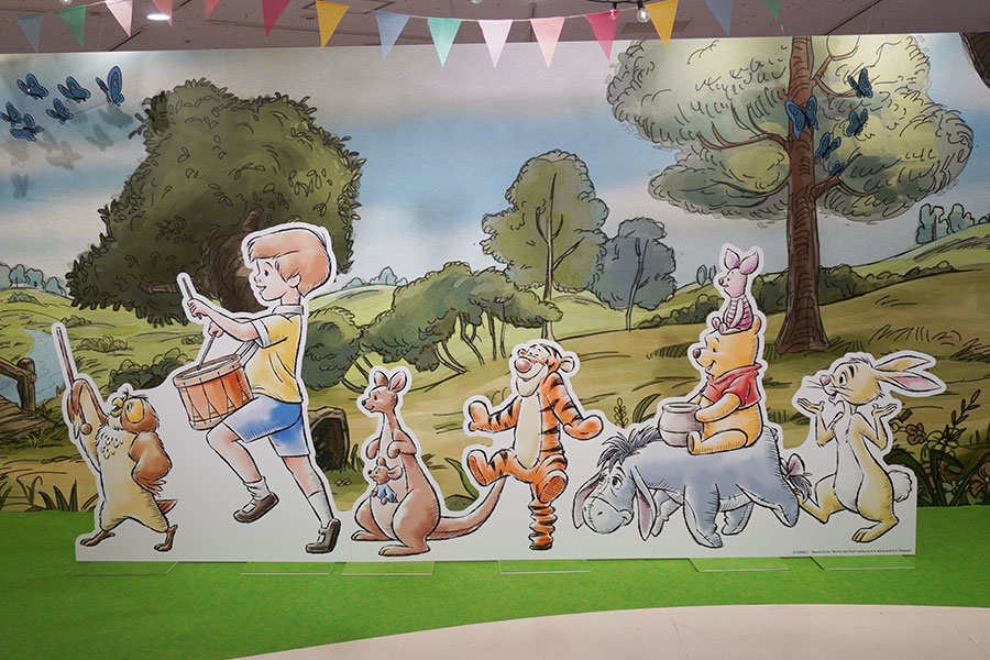 2022年、くまのプーさん95周年を記念して開催された同催事。2年ぶりの開催となる今回も童話の舞台となる「100エーカーの森」へ入り込んだような演出が随所に施され、エントランスでは100エーカーの森の中を行進しているくまのプーさんと仲間たちが出迎えてくれる。