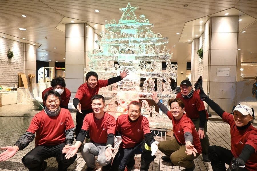 木の土台をつくる人、パーツを作る人、チェーンソーなどの電動工具や、ノミなどの手彫りも駆使しチームワークよく、氷の塊をどんどん作品に変えていく。寒さが厳しい中、詰めかけた来場者にも見守られながら、約6時間、重さ135キロの氷を6本と格闘し続けた「氷彫刻制作クラブ」。疲れもあったはずだが、ツリー完成後の記念撮影の表情は、とても晴れやかだった。