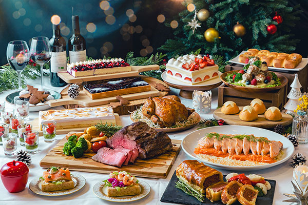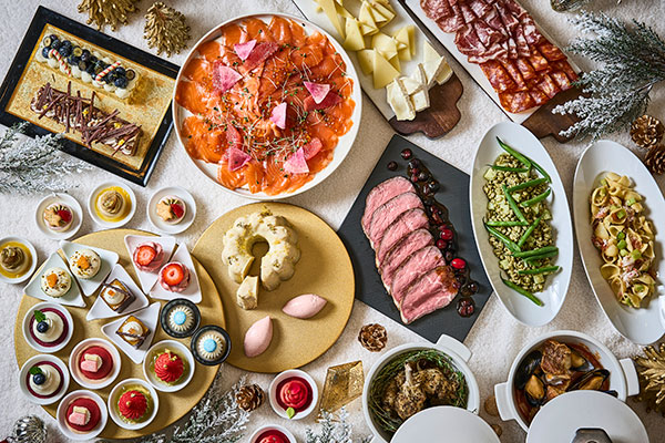 [中之島]本ズワイガニやシュトーレン、その場でシェフが切り分ける国産牛のローストビーフなど、家族そろって楽しめる50種以上の料理が並ぶ。