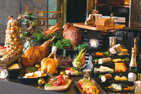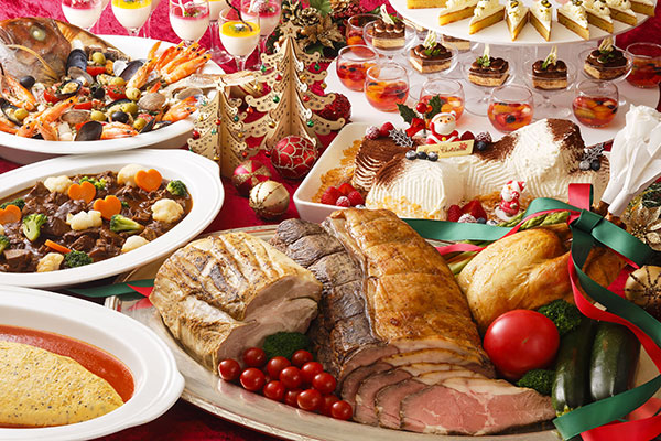 [神戸メリケンパーク]ローストチキン、クリスマススイーツなど40種類以上のブッフェ料理が並ぶ。ホテル伝統のローストビーフは、シェフが目の前で仕上げて提供。