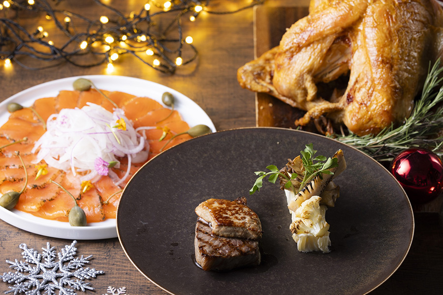 選べる料理には、「骨付き牛ロースの炭火焼き」や「オマール海老のパイ包み焼き」など、クリスマスらしいメニューがラインナップする。