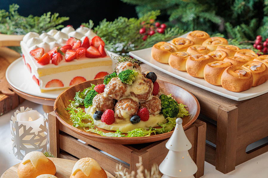 定番料理「ミートボール」や、オープンサンド「スモーブロー」で、北欧の世界観を味わうことができる。そのほか、目の前で切り分ける「ローストビーフ」や、クリスマス定番の「ローストチキン」、「ミートローフのパイ包み焼」、ショートケーキなどのスイーツが登場する。