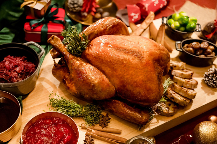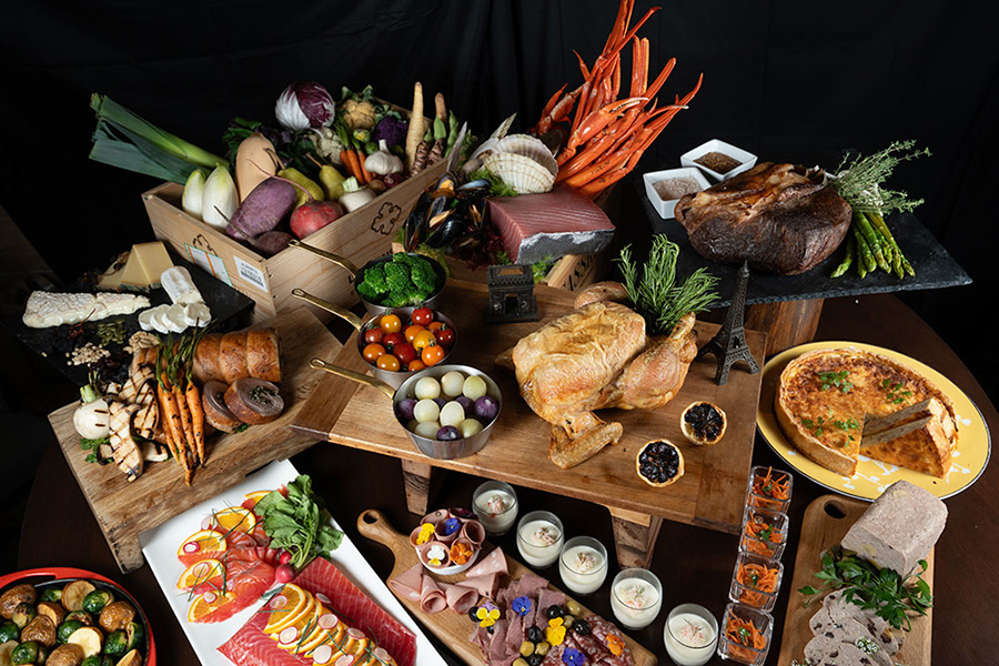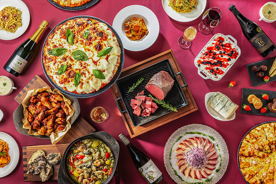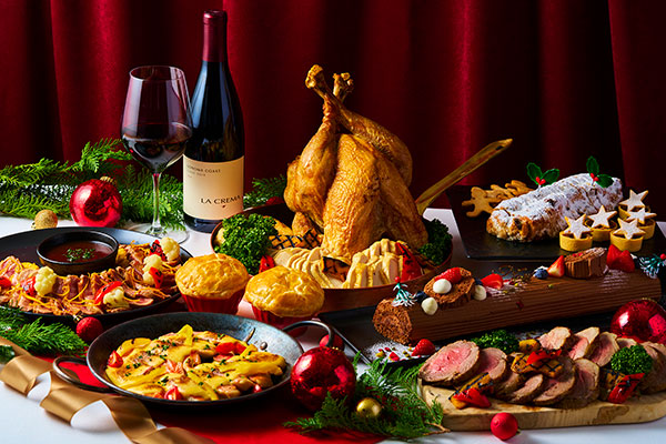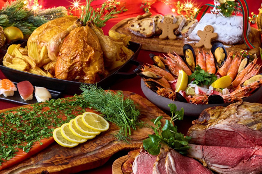 家族で楽しめる、50種類以上のメニューが登場。本ズワイガニ入りのヌードルや、ローストビーフ、ローストチキンなど、クリスマスにぴったりのごちそうが並ぶ。
