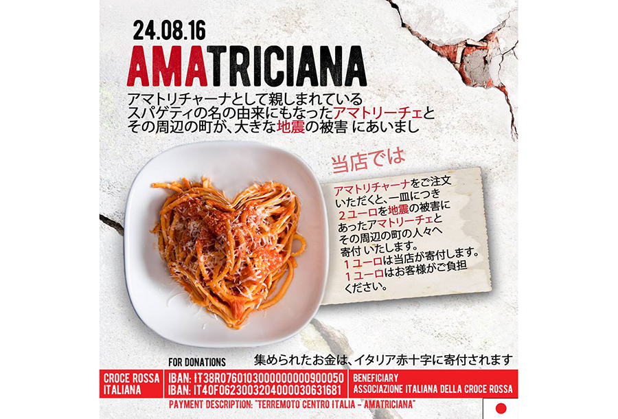 8月24日に発生したイタリア中部地震の支援活動として、パスタ「アマトリチャーナ」を食べて支援しようという動きがイタリアから広まり、関西のイタリア料理店でも急速に広まっている。