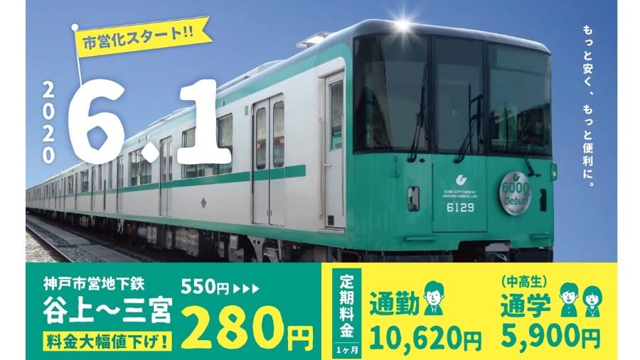 神戸市営地下鉄「新神戸駅」と神戸市北区の玄関口「谷上駅」を結ぶ私鉄「北神急行」が、6月1日から市営化。「神戸市営地下鉄 北神線」となることにともない、谷上~三宮間の片道運賃が550円から280円と半額近い値下げが実現する。
