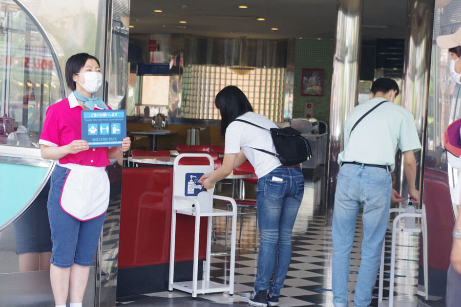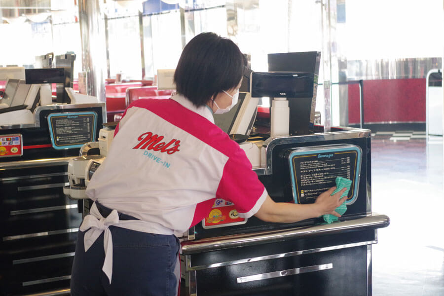 また会計時は、キャッシュレスを推奨。会計ごとにクルーは手指を消毒し、キャッシュトレーやクレジット決済端末などレジ周りもその都度消毒するという。