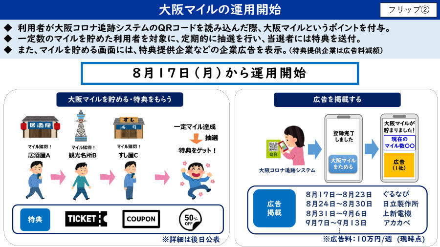 また、「大阪マイル」と呼ばれるポイント制度を導入。利用者がQRコードを読み込んだ際にポイントがたまり、一定数がたまった場合に抽選がおこなわれ、当選者には特典が送付されるという。