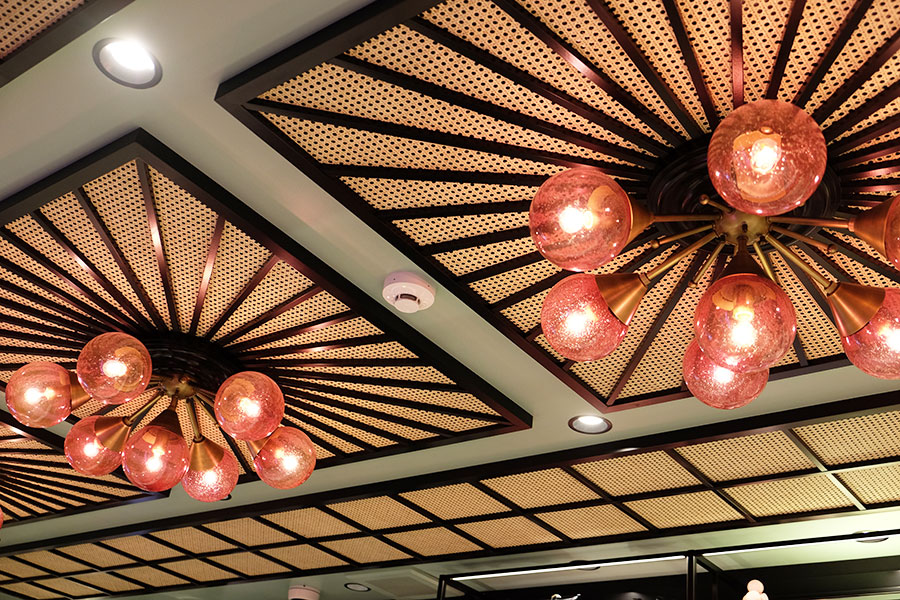 店内は竹林を描いた壁紙や、障子や襖をイメージした壁や天井、京桜を思わせるライトなど京都の伝統を取り入れ、フランスの建築家・デザイナーのシャルロット・ペリアンからインスピレーションを受けながら、ラデュレらしいエレガントさとかわいらしさで表現している。