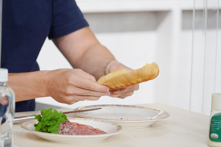 フィセルを使った「熟成サラミサンド」を食べるマッシさん(提供:note)