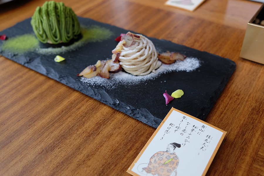 • 日本最古とも言われる滋賀県産のお茶・朝宮茶の抹茶を使ったモンブランプレートは「奥山に もみぢふみわけ なく鹿の 声聞くときぞ 秋はかなしき」(猿丸太夫)をイメージ