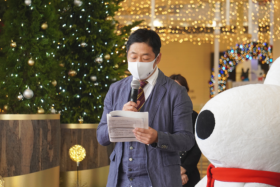 • 「阪急西宮ガーデンズ」でおこなわれたクリスマスイベントに登場した、BMX選手の中村輪夢選手(左)と安田大サーカス・団長安田(右)