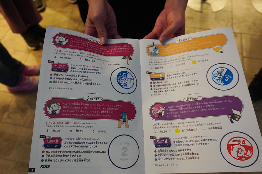 「未来を変える!アクションラリー」と題したアクティビティでは、クイズ、スタンプラリー、展示を通して「サンゴの減少問題」「食品ロス問題」「服の大量廃棄問題」などを学び、またそれぞれの課題の解決方法を子どもたちが考えられるよう構成されている。