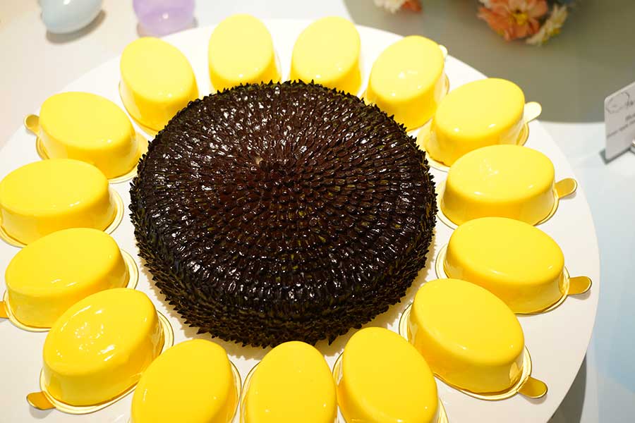 ペイストリーシェフ・百田利治さんは、「『サマーフェスティバル』のイメージをメインに、サンリオキャラクターとコラボしました。ポムポムプリンたちがビジュアルでも身につけている夏の花を、さまざまなスイーツでも表現しています」と話す。