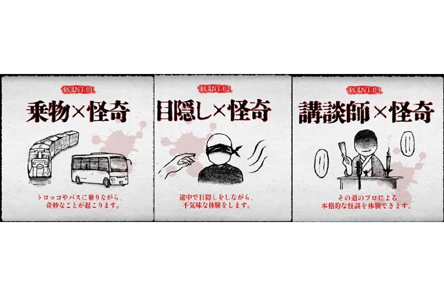 トロッコが終点・亀岡駅に着くと、怪奇現象が起こるバスに目隠しをして乗車。到着した某宿泊施設でプロの本格的な怪談を体験・・・と、恐怖三昧なツアーとなっている。夜6時に「トロッコ嵯峨駅」に集合で、ツアー本編の所要時間は100分前後。料金は1人3500円。8月は2便、9月は1日1便の運行となる。詳細は公式サイトにて。