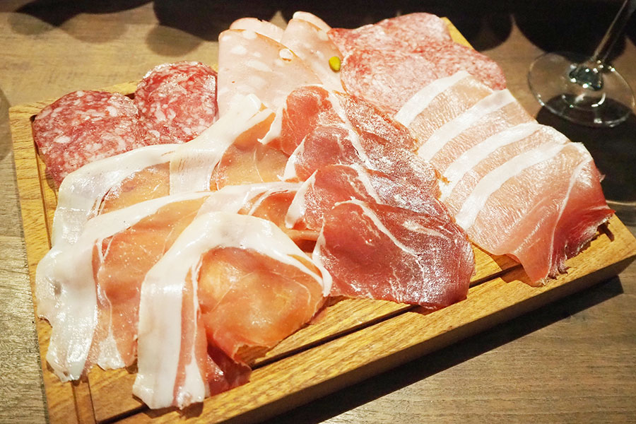 たとえば、「生ハムとサラミ類6種盛り合わせ」(1210円~)のなかにある、同店おすすめの生ハム、スペイン産ハモン・セラーノ。14カ月熟成させたコク深い旨みが魅力で、口のなかでとろけるよう約0.2ミリの薄さにスライスするこだわりようだ。