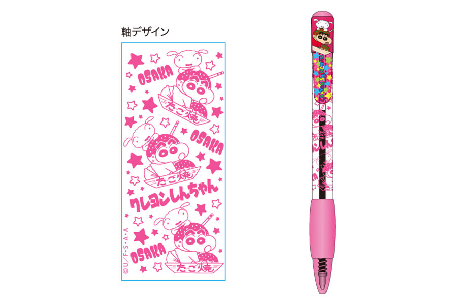 国内外にファンをもつ同作が、今回は大阪名物をモチーフにしたアイテムに。お好み焼き屋さんに扮したり、大阪城をバッグに殿様姿に変身したしんちゃんと、野原家の愛犬・シロが描かれた「アクリルキーホルダー」(全5種・500円)のほか、頭がたこ焼きになったしんちゃんの「A4クリアファイル」(400円)、ステッカー、ボールペンなど、全7種類が販売される。