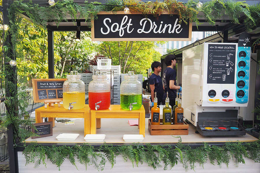 ドリンク類は、王道のビールやワインといったアルコール以外も充実させ、昨年より20種追加。アルコール分の低いハイボールを作れるリキュールは、ジュースとの配分が書かれたボードを見ながら自分好みの1杯を試すことができる。色味が映える「ライム&ミント」「クラフトレモネード」などの果物シロップも並び、炭酸水やソーダ割りが楽しめる。