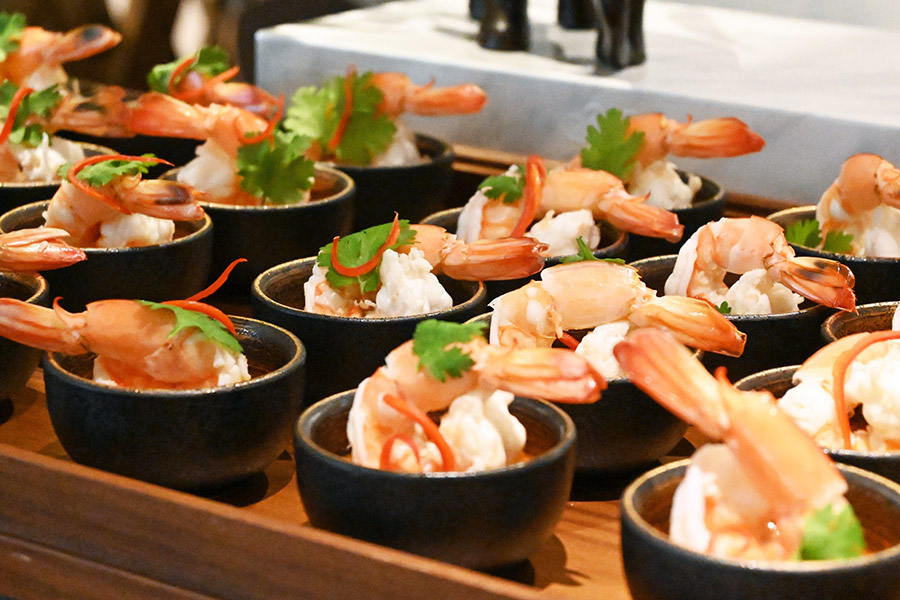 タイ人の料理長ソンポン・アサセットさんによる本場のタイ料理は、定番の「トムヤムクン」のほか、お祝いのときに食べられる「海老のスパイシーディップライスクラッカー添え」など、どれも華やか。ジャスミンライスも、今回のビュッフェのテーマに合わせて、スイカジュースでピンクに染めたオリジナルだ。