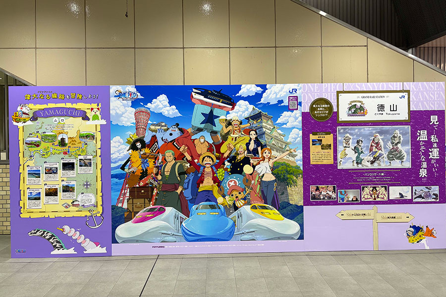 また、7月下旬頃からは山陽新幹線全19駅にオリジナルデザインの立て看板が登場。それぞれの駅と『ワンピース』の物語がシンクロし、新大阪駅の「イーストブルー編」から博多駅の「エッグヘッド編」まで、各駅の観光地を作中のシーンと名セリフで表現。その駅でしか見ることができないスポットとなっている。