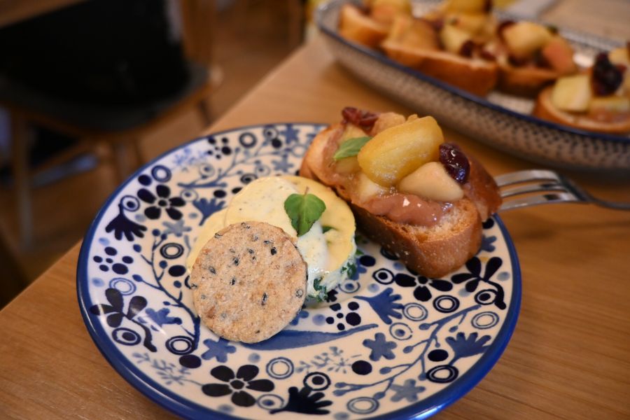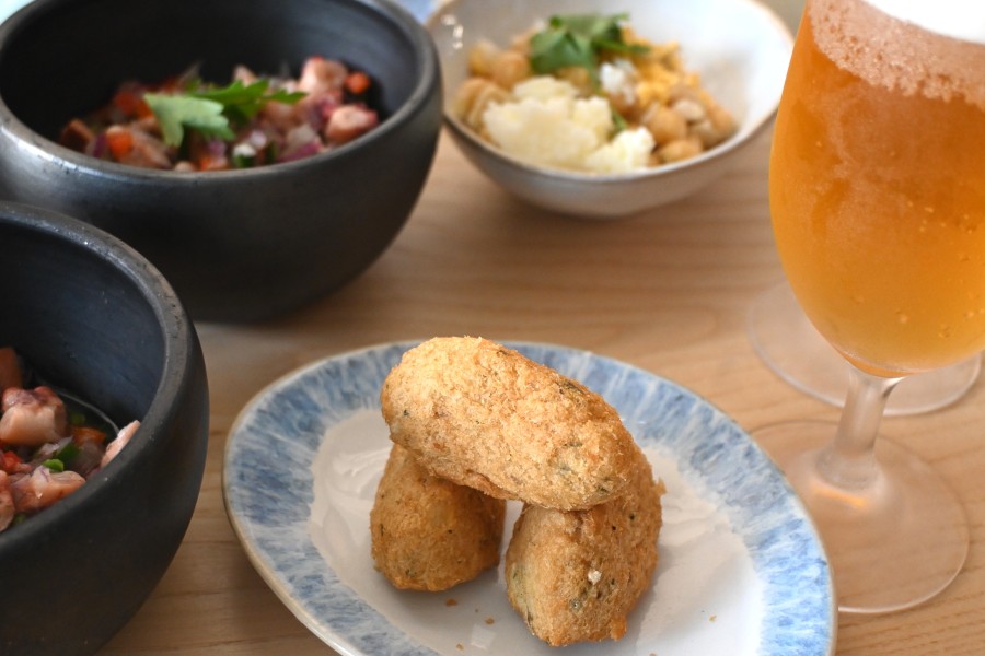 • タコや鱈を使ったさまざまな料理が揃う。中央はバカリャウのコロッケ3個(1100円)(大阪・関西万博 /Lmaga.jp編集部撮影)