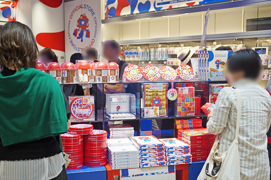 • 「心斎橋PARCO店」のお菓子のなかで、一番の人気商品は黄色い缶の「EXPO2025 ミャクミャクサブレ」(1550円)(9月26日撮影/Lmaga.jp編集部)