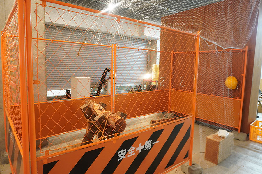 棍棒の展示以外に楽しめるのは、なんと「棍棒の試し打ち」。会場内後方に設けられた試し打ちスペースには、大・中・小の3本の棍棒と、棍棒を打つための木が用意されている。