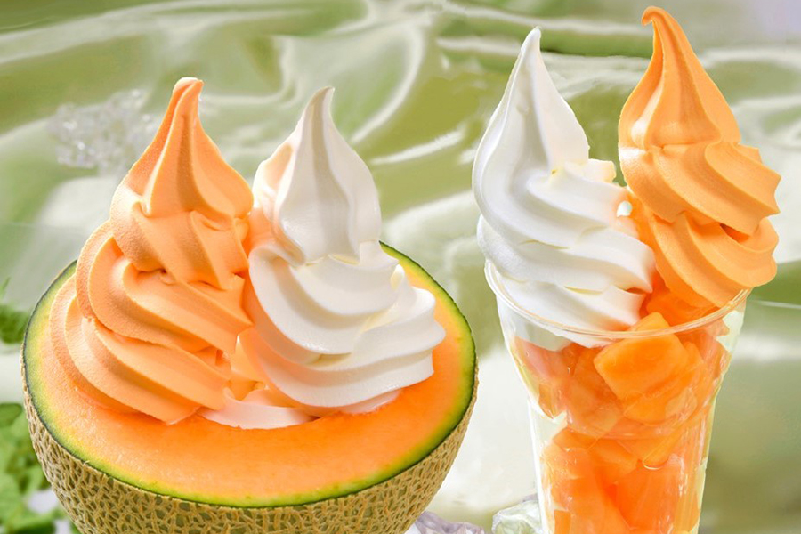 左から、『阪神秋の北海道市場』に登場する「札幌やおきゅう」の生メロンソフトクリームダブル(1個1980円)、生メロンパフェダブル(1個1320円)は両商品各日販売予定数50個