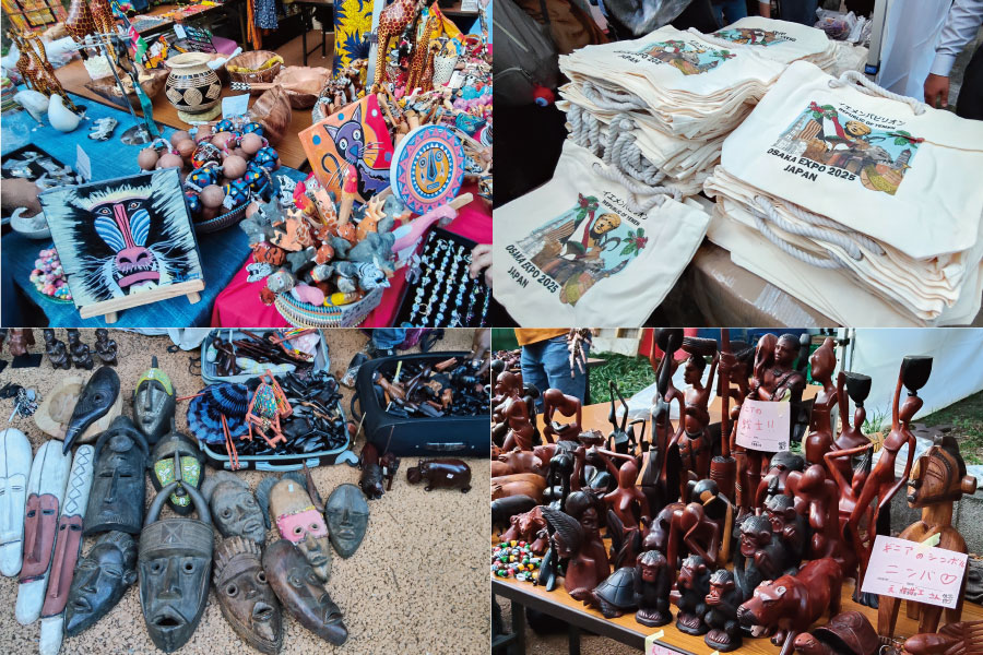 メインとなるのは、万博出展店舗を中心とした世界各国の雑貨やフードを販売する屋台エリア『SEKAI BAZAAR』。フランス館に出店していたパン屋「メゾンカイザー」の紅茶や、イエメン館ロゴが入ったトートバッグ、各国のカラフルなシャツやワンピース、帽子、煌びやかなアクセサリー、個性的な置物、絵画、楽器などがずらりと並ぶ。