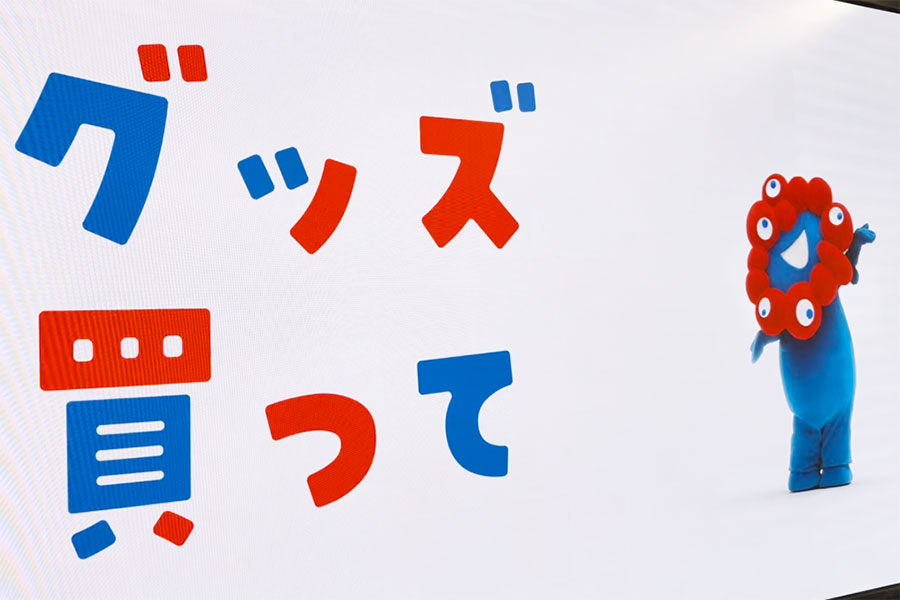 夢洲駅で放映されているミャクミャクのグッズ広告動画(夢洲駅 プロモーション動画 スペシャルバージョン/10月1日・Lmaga.jp撮影)