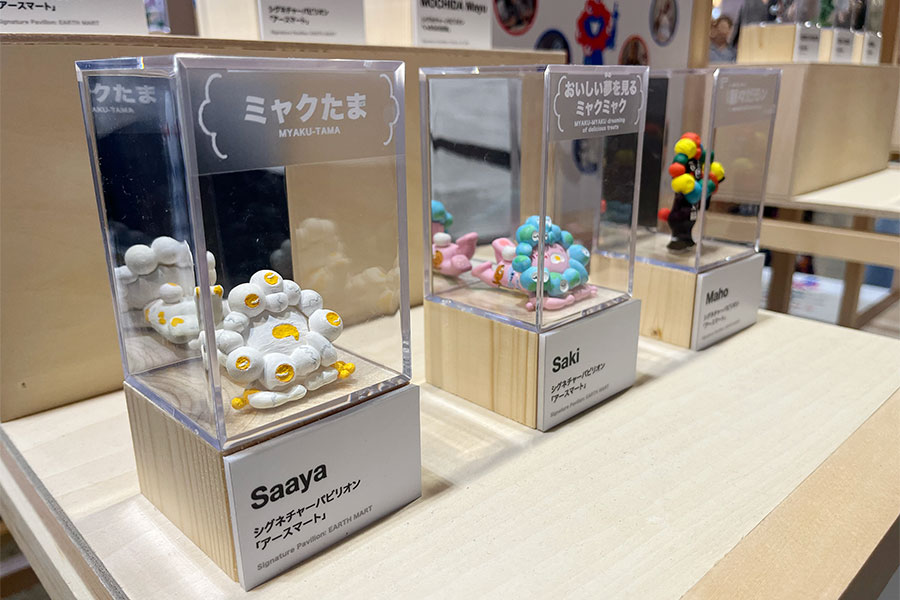展示されているミャクミャクのポーズは寝そべったり、座ったりとさまざま。フィギュアはそれぞれ小さなカプセルに囲われており、「ミャクたま」「ぎらミャク」「通天ミャク」「闇ミャク」といったタイトルに合わせ、作成者と在籍するパビリオンも合わせて明記されている。