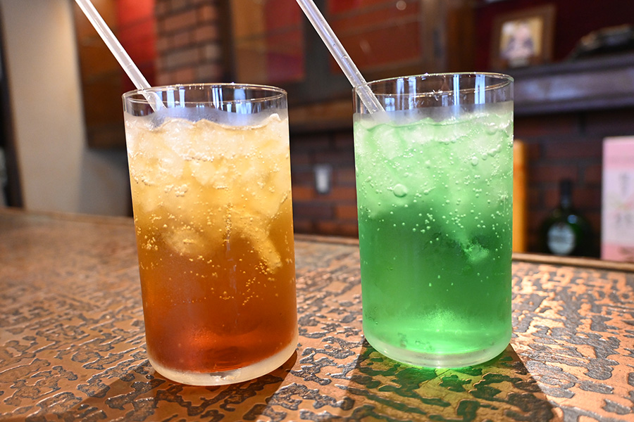 • 「クレープ喫茶えんどう南田辺店」ではドリンクメニューも。左から、紅茶ソーダ、メロンソーダ(各450円)。全てのドリンクに+250円でアイスも