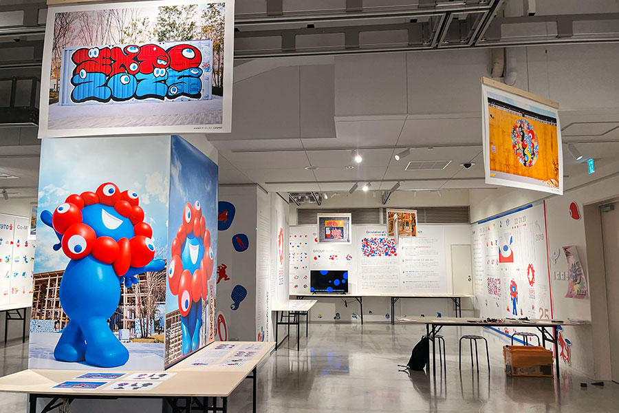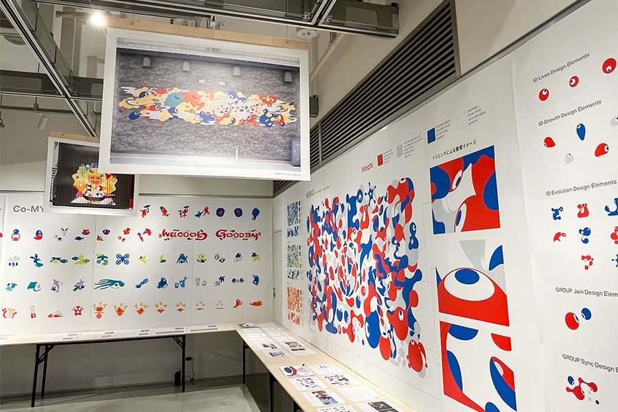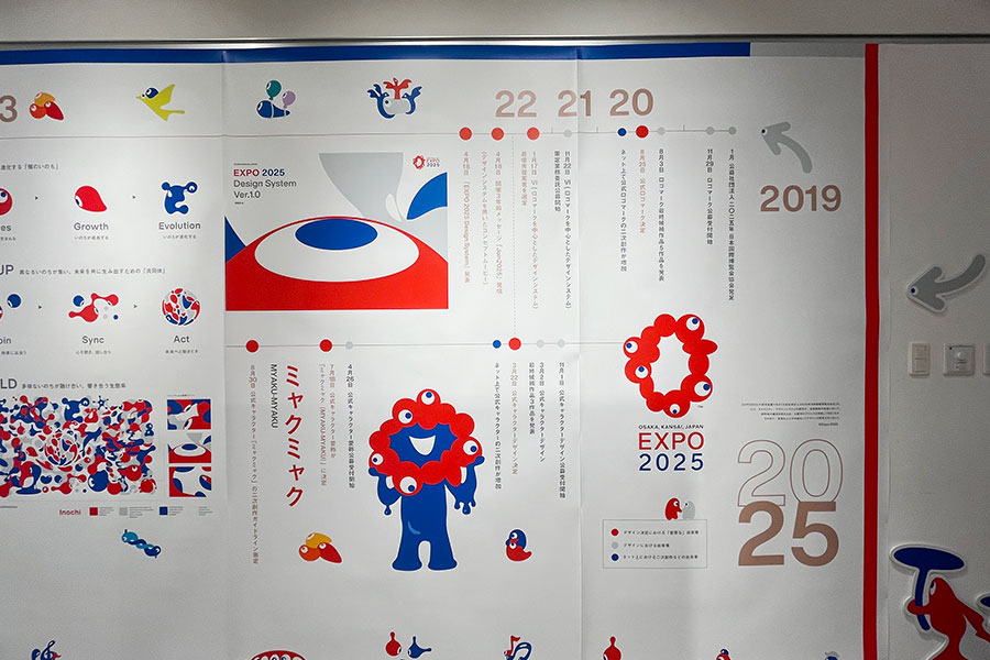 万博といえば、今や屈指の人気者となった公式キャラクター・ミャクミャクやSNS上で「こみゃく」という愛称がつけられてから人気に火がついた「ID」の存在は欠かせない。同展では、そのデザインが生まれ、今のような一大ムーブメントに至るまでの過程を示した年表や、どのような思いやコンセプトが込められているかを展示する。