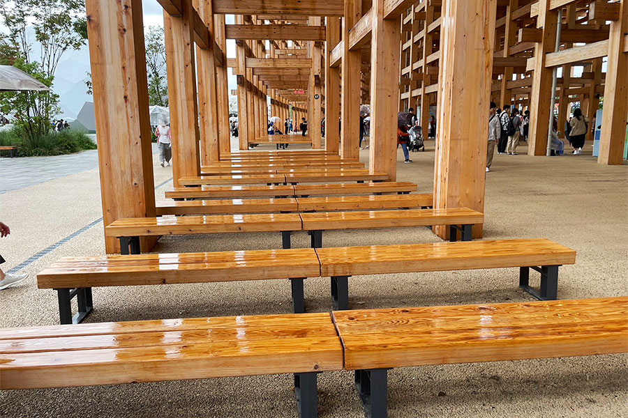 雨がチラつくスタートとなったが、相変わらず人気パビリオンには行列が。11時頃になるとアメリカ館はさっそく入場規制となり、2時間待ちの列となった。一方で雨に濡れた大屋根リングベンチに座る人の姿はほとんどなく、連日混み合う会場内では珍しい光景が広がっていた。