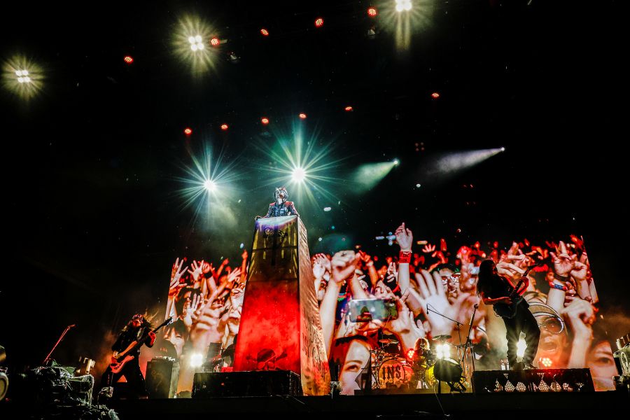 予定より遅れてスタートしたこの日のステージ。オペラ座の怪人のようなマスクをつけたHYDEが登場すると、会場からは大歓声。『TAKING THEM DOWN』で赤いライトに照らされながら、塔の上から「Are You Ready 万博ー!」と、観客を「デス声」で煽る。
