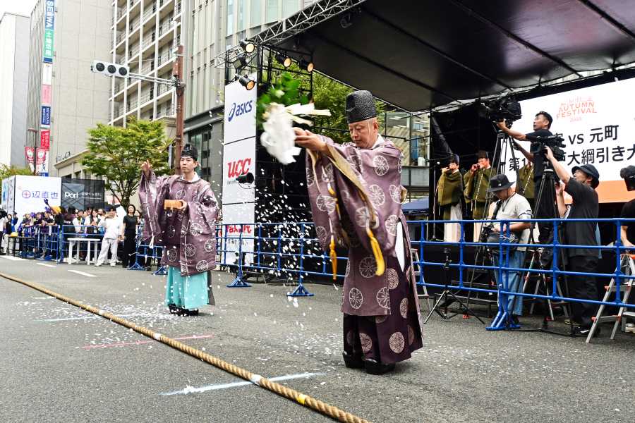 綱引き開始前に「生田神社」の清めのお祓いがおこなわれ、本番がスタート。元町は「大丸神戸店」店長・松原亜希子さん、三宮は「阪急百貨店」の店長・杉崎聡さんがキャプテンを務めた。