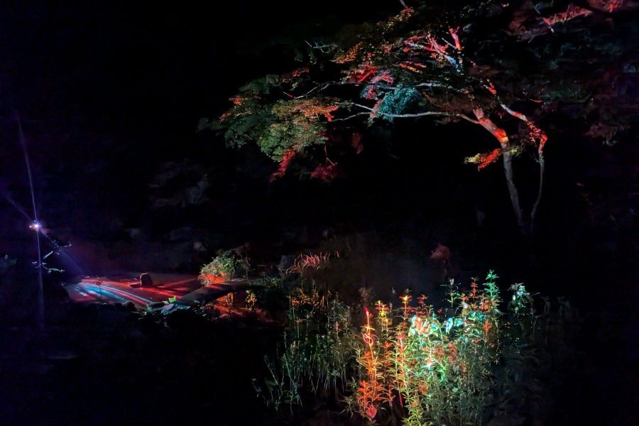 そのほか、映像作家・ソネソラによるインスタレーションや、インセンスブランド・リスンによる香りの演出など、こだわり尽くしの演出も。イベントが進むにつれ、美しい庭園と隣接する、開け放たれた「方丈」は、蝉の声から、涼しげな秋の虫の声に包まれ、まるでアーティストたちと虫たちのセッションのような展開に。