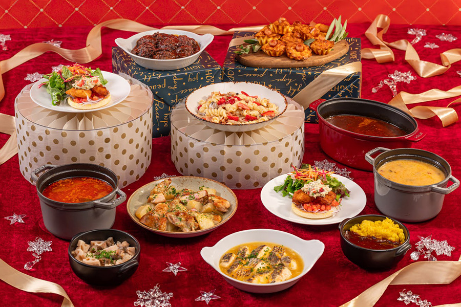 ビュッフェ会場には、クリスマスツリーのような超巨大「ミル・ミル・サントノーレ」が登場(ディナー限定)。パイ生地にプチシューを飾ったスイーツ「サントノーレ」の巨大サイズが、真っ赤ないちごバージョンで現れる。