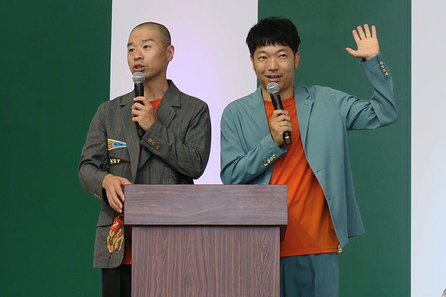 セレモニーのMC・アキナから、何かモチーフがあるのか?と問われたOZAKI氏は、「子どもの頃、買い物袋からネギが飛び出ていて、子ども目線だと目の前でいつも揺れてるんですよね。僕のなかの幼少期の一つの風景として残っていた」ときっかけとなったエピソードを明かした。