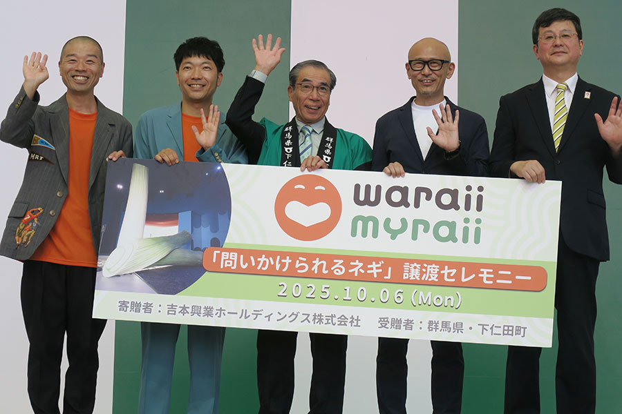 『大阪・関西万博』よしもとパビリオン内にある、4m(全長8m)の巨大なアート作品「問いかけられるネギ」。見る人に「これは何?」「なぜここにネギが?」という問いを生み出す不思議な作品としてSNSでも話題になっていたが、閉幕後の行き先が決定。10月6日、同パビリオン野外ステージにて譲渡セレモニーがおこなわれた。