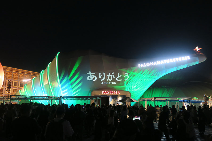 パソナ館では「ありがとう また、淡路島で会いましょう」の外壁プロジェクションマッピング、パナソニック館(ノモの国)では「今までありがとう」の垂れ幕が出現。