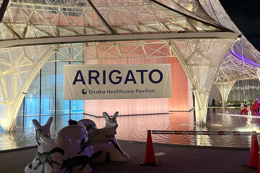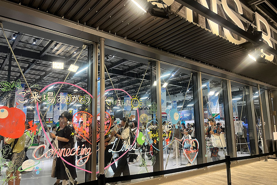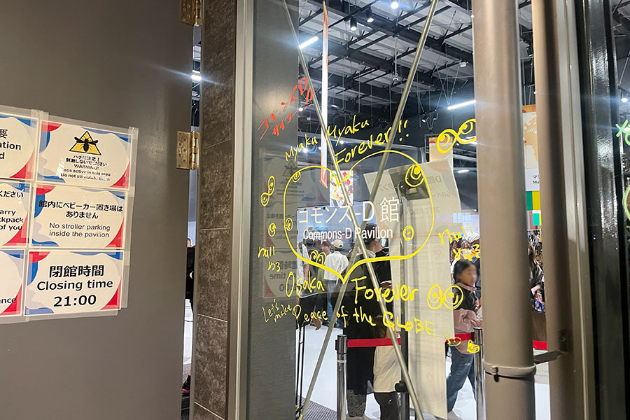 閉幕まで最後の三連休初日。コモンズ館の窓にはスタッフからのメッセージが寄せ書きで伝えられ、パソナパビリオンの巻き貝棟には「ファイナルカウントダウン 2Days」「ありがとう」の文字が投影されたり、大阪ヘルスケアパビリオンの入り口には「ARIGATO」の幕が設置されていたりと、会場全体が万博フィナーレのムードに。