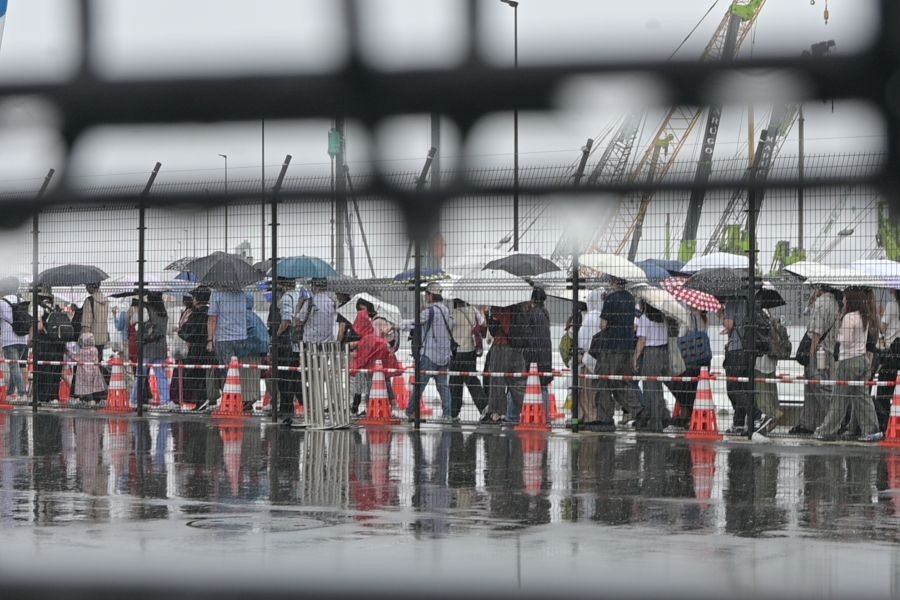 閉幕まで残り1日となった10月12日(日)。朝から強い雨が降っていたが、夢洲駅から西ゲートを目指す人は多く、傘の列が続いた。