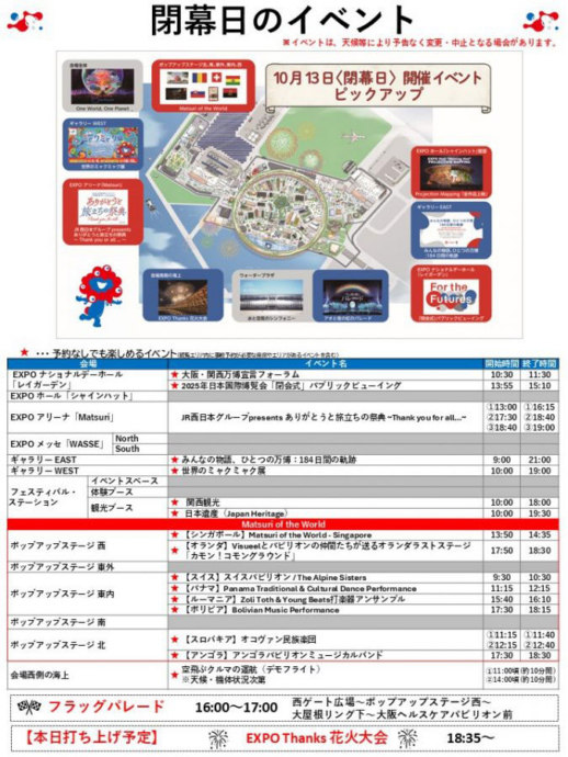 「カナダ・パビリオン」ではカラオケ大会が開催され、スタッフを中心に来場者と皆でセリーヌ・ディオンを2度もシンガロング。本日の閉幕日も夜まで各所がお祭り騒ぎとなりそうだ。