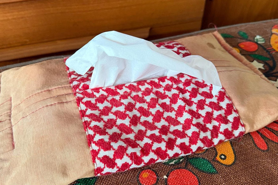 例えば、リビングで20年間使用しているヨルダン館で買ったティッシュケースは、アクセントの赤い生地は色褪せてしまいましたが、クーフィーヤ(アラブの伝統的な頭巾)の生地は当時のままです。
