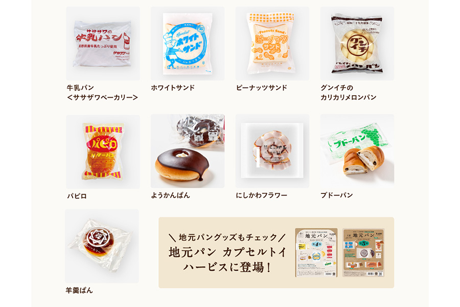 また、「ザ・リッツ・カールトン」のグルメショップや「フォーシーズンズホテル大阪」の「フェリーヌ」なども出店。さらに、全国各地で長年愛されているユニークなネーミングやレトロなパッケージのパンも勢ぞろい。長野県の「牛乳パン」や石川県の「ピーナッツサンド」、鳥取県の「ブドーパン」まで9種がラインアップ。これらの地元パンは、ミニチュアチャームのカプセルトイとして会場に登場も。