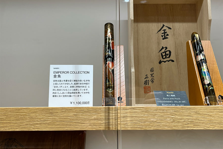プレゼント需要も高いという万年筆は、ビギナー向けの1000円台から、美しい伝統工芸・蒔絵が施された100万超えのものまで、多彩なデザインを展開。なかでも、大正期に万年筆から始まったオリジナルブランド「ROMEO」のコーナーには椅子を備えたカウンターが登場し、百貨店の客層に合わせた、ゆっくりとラグジュアリーな商品選びをできる工夫が。